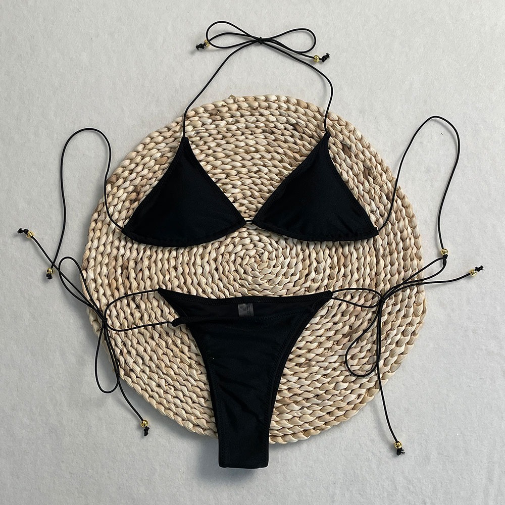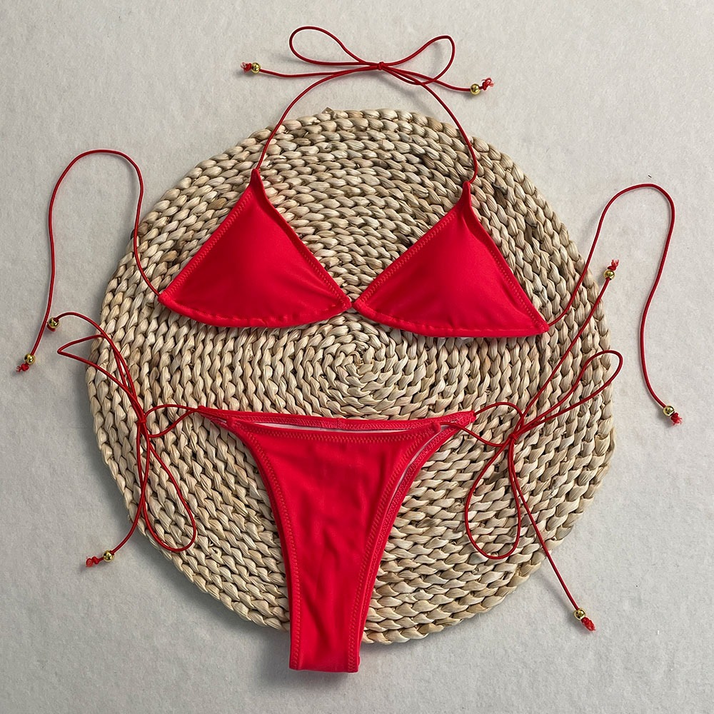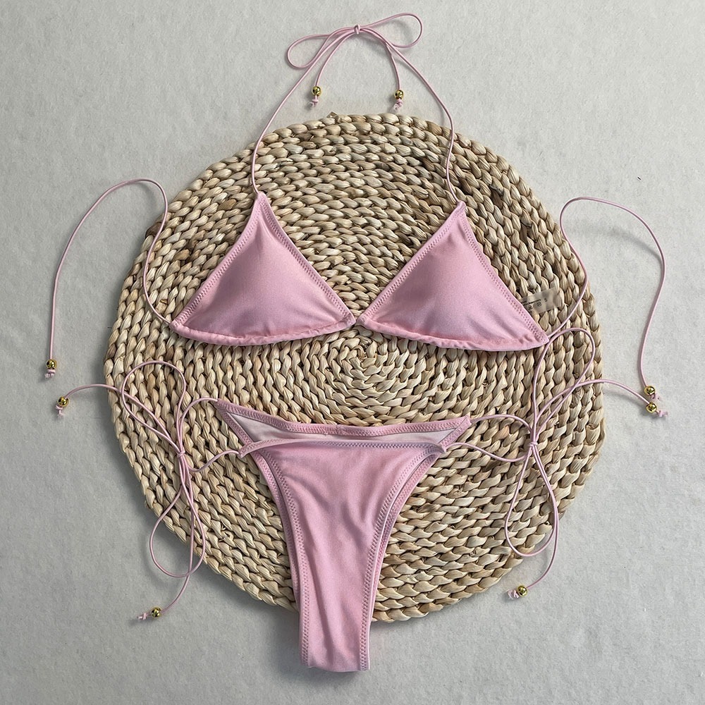 2025 Adjustable Women’s Bathing Suit Beachwear Solid Rope Two-Piece Swimwear Lace-up Halter Split Bikini Set
