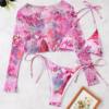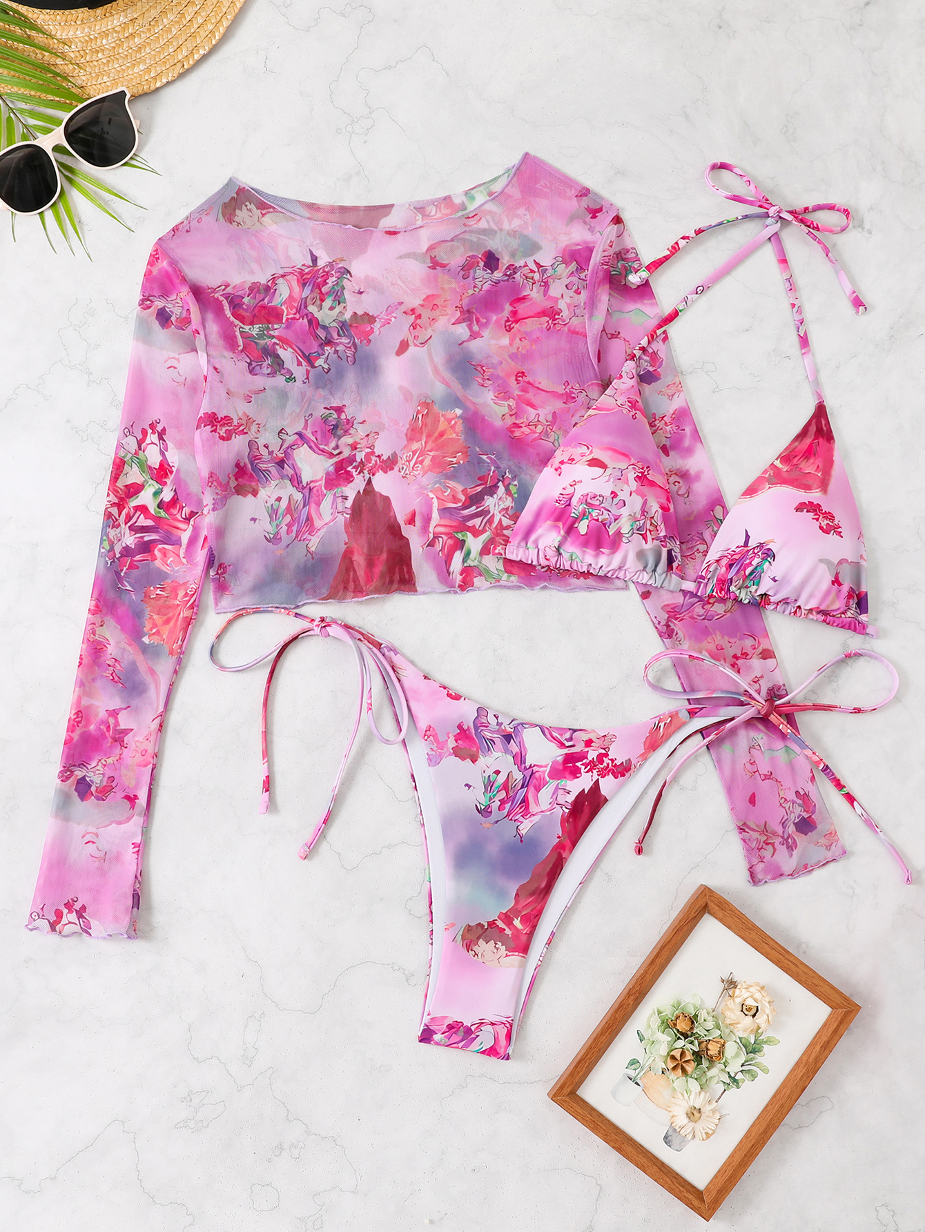 2025 Bikini Three-piece Set Women Thong Print Swimsuit Low Waist Summer Mesh Blouse Swimming Pool Bikini Set Brazil Set