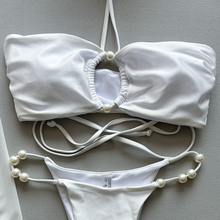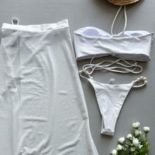 2025 Halter Neck String Bikini Set Pearl Lace-up Three-piece Swimwear Whit Skirt Cover Up Women’s Bathing Suit