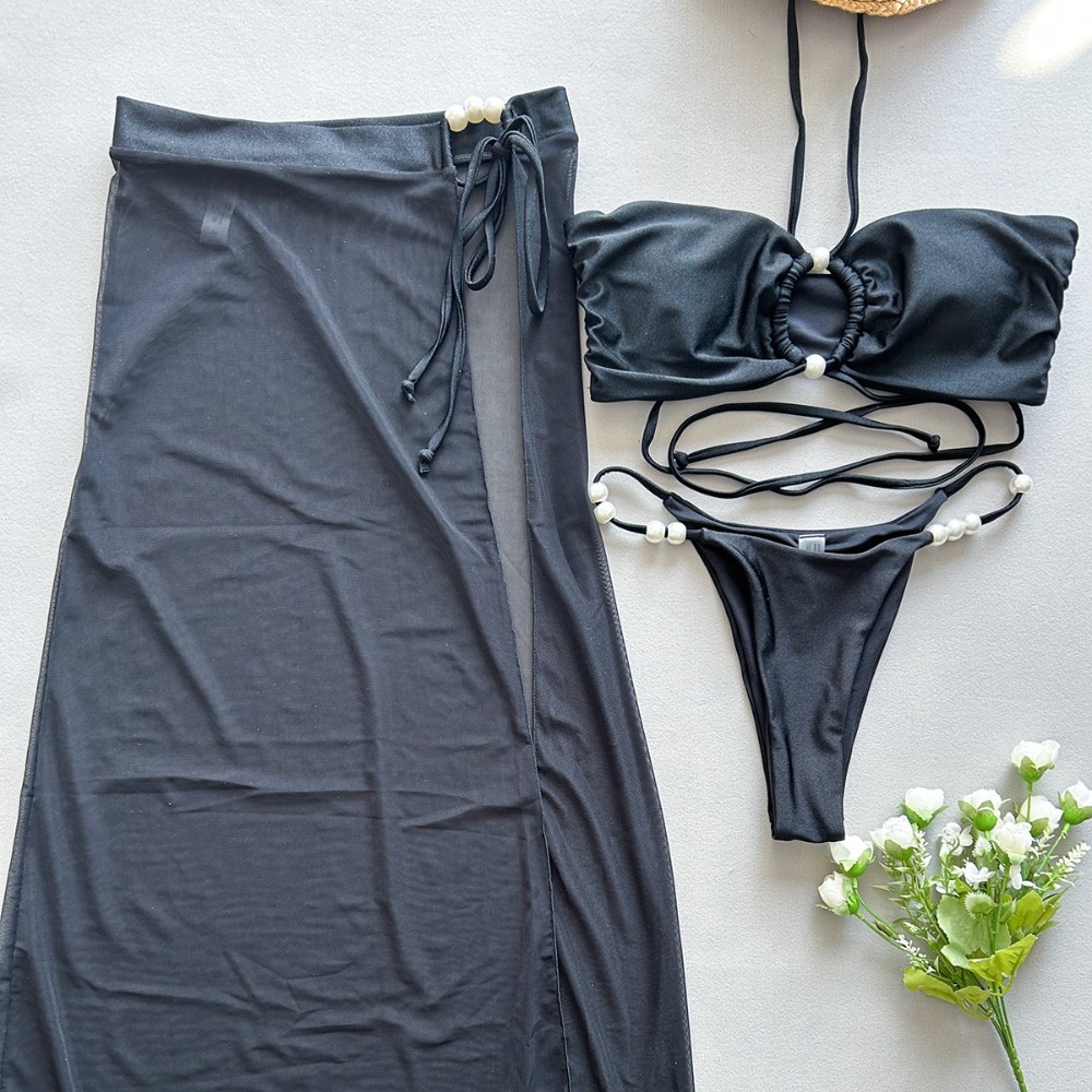 2025 Halter Neck String Bikini Set Pearl Lace-up Three-piece Swimwear Whit Skirt Cover Up Women’s Bathing Suit