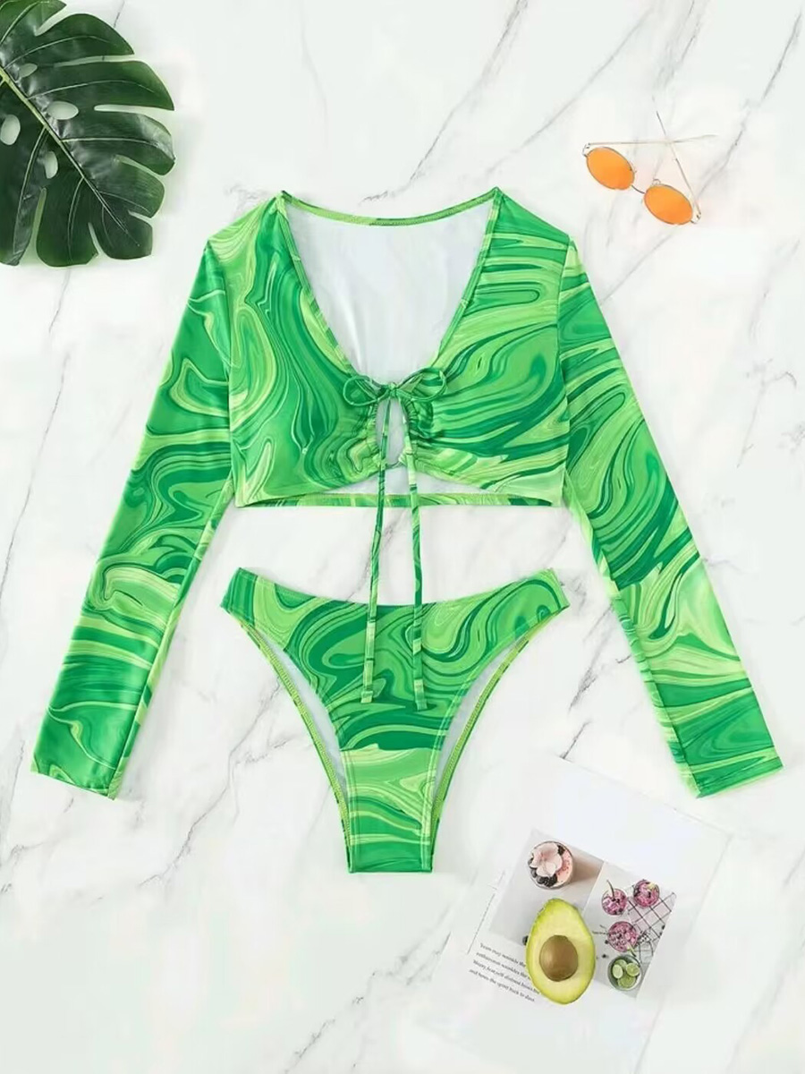 2025 Hollow Out String Long Sleeve 2 Piece Bikini Women Swimwear Female Swimsuit Bathers Bathing Swimming Suit Beachwear Summer