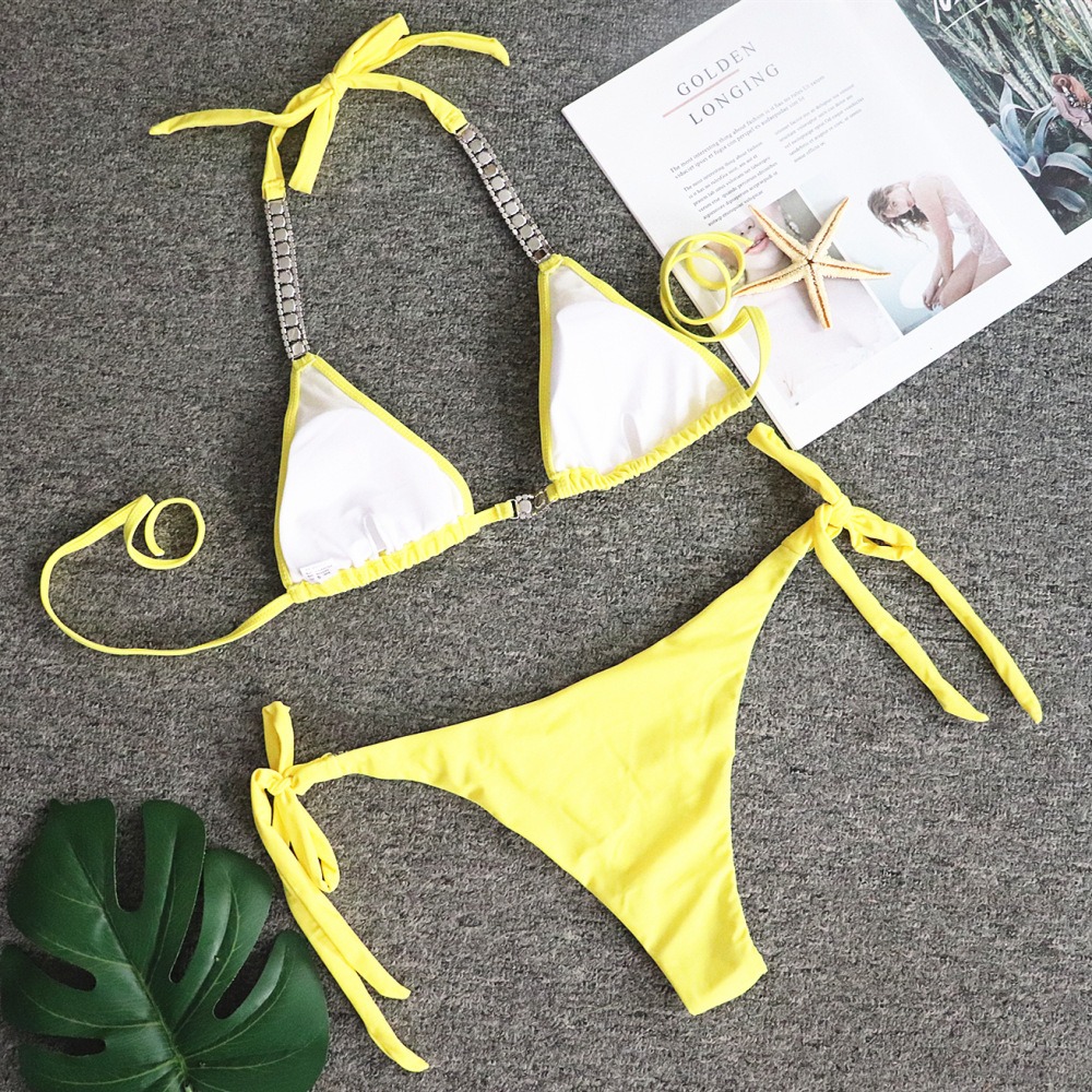 2025 Lace-up Women’s Rhinestone Two-Piece Swimsuit Solid Split Halter Bikini Set Bathing Suit Vacation Beachwear