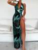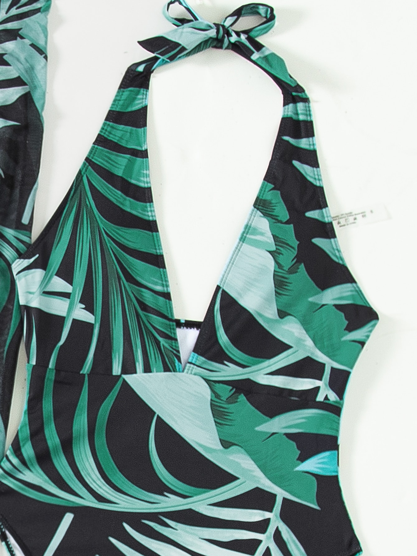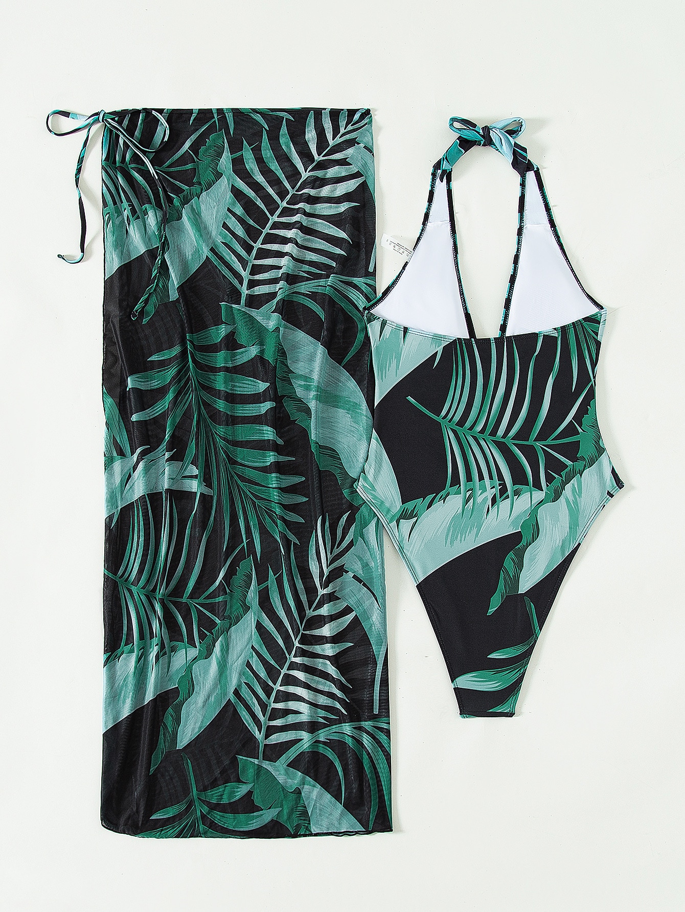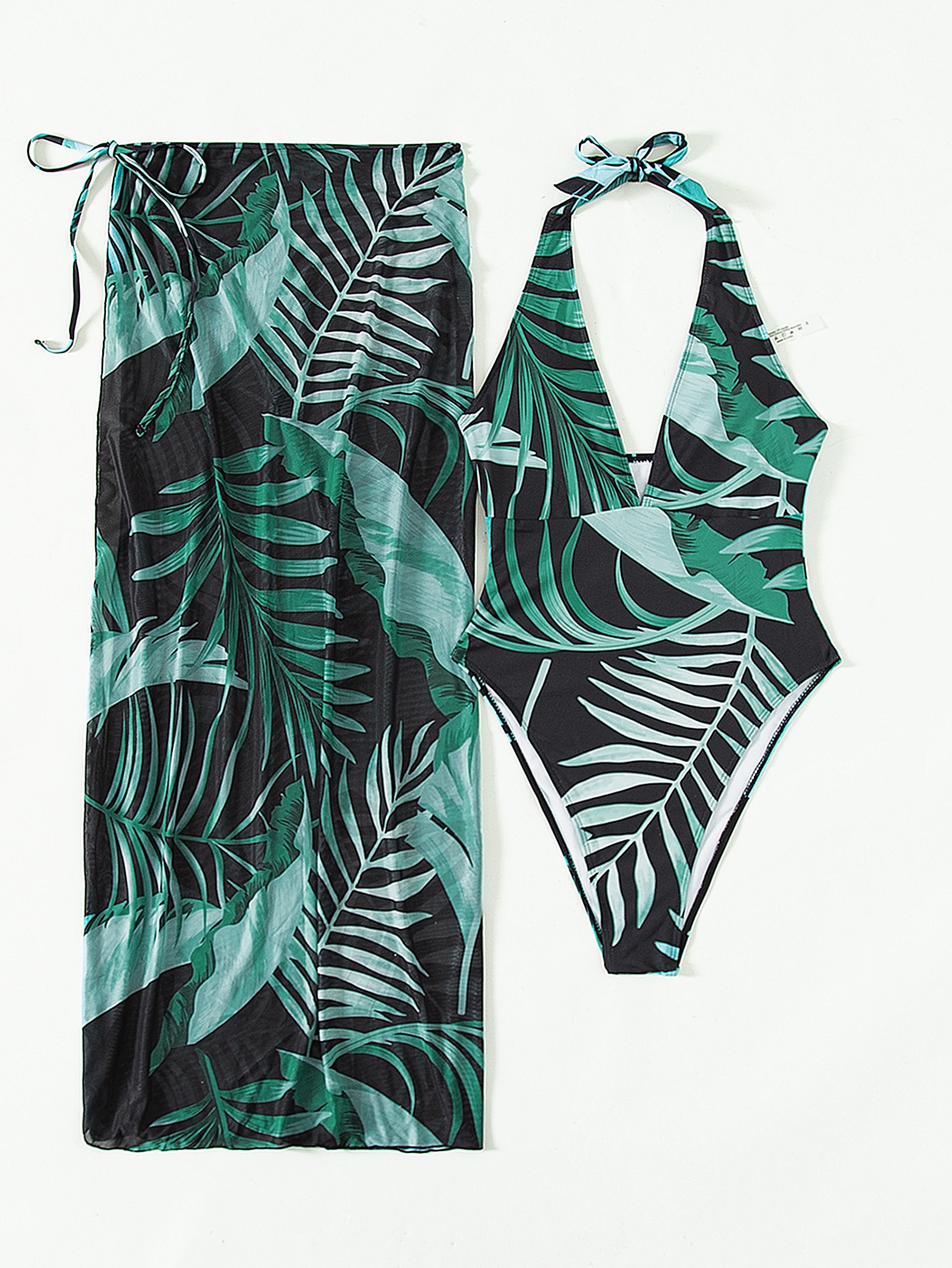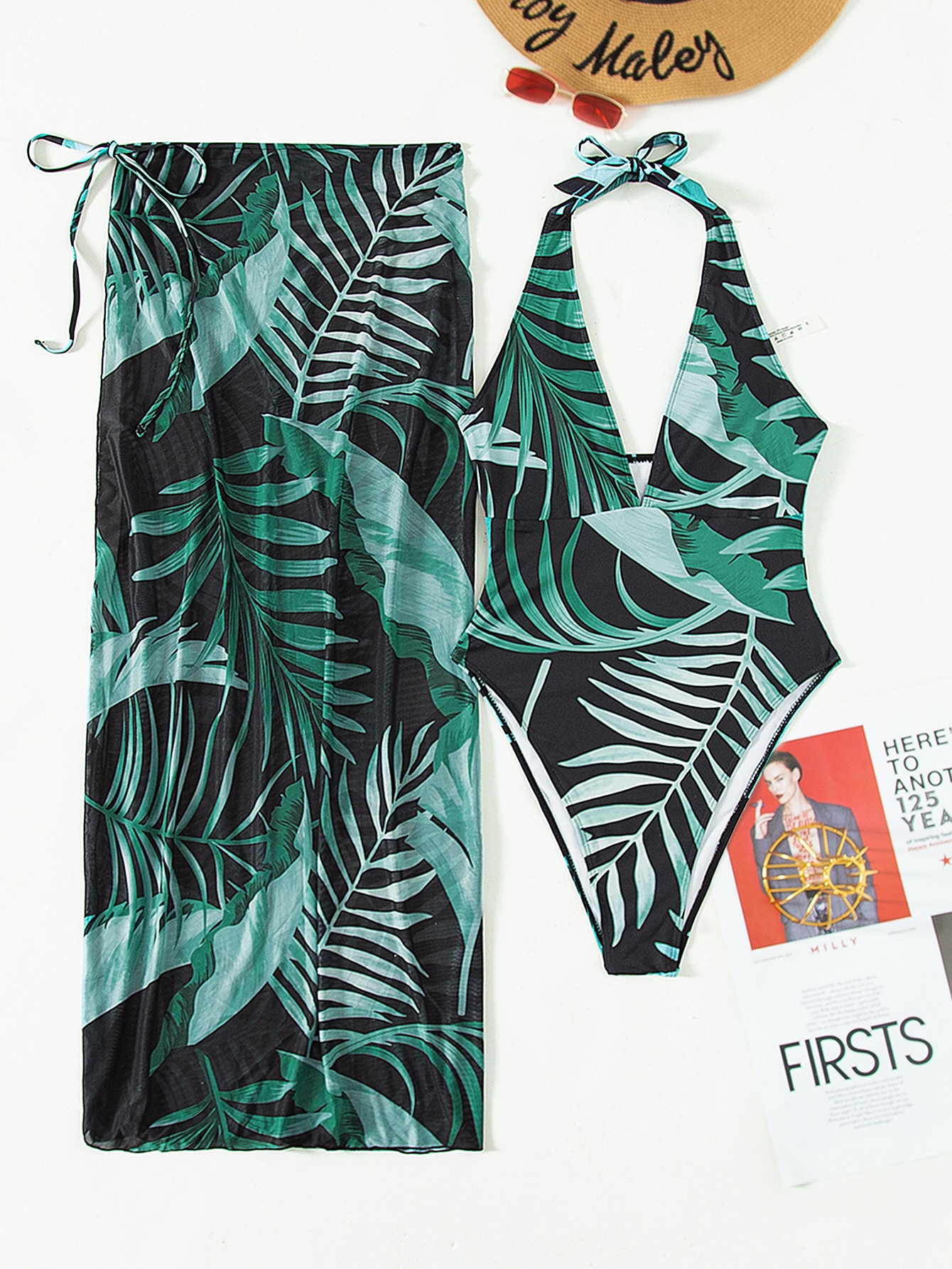 2025 Plant Print Halter One Piece Swimsuit & Beach Skirt Swimwear Women Bathing Suit Female Swimming Summer Beachwear