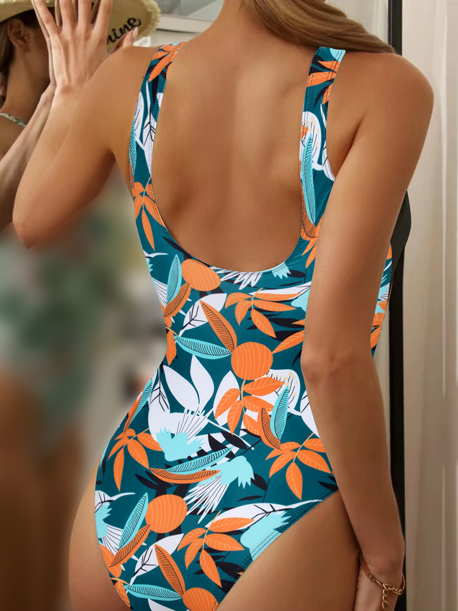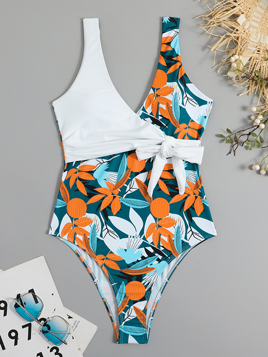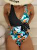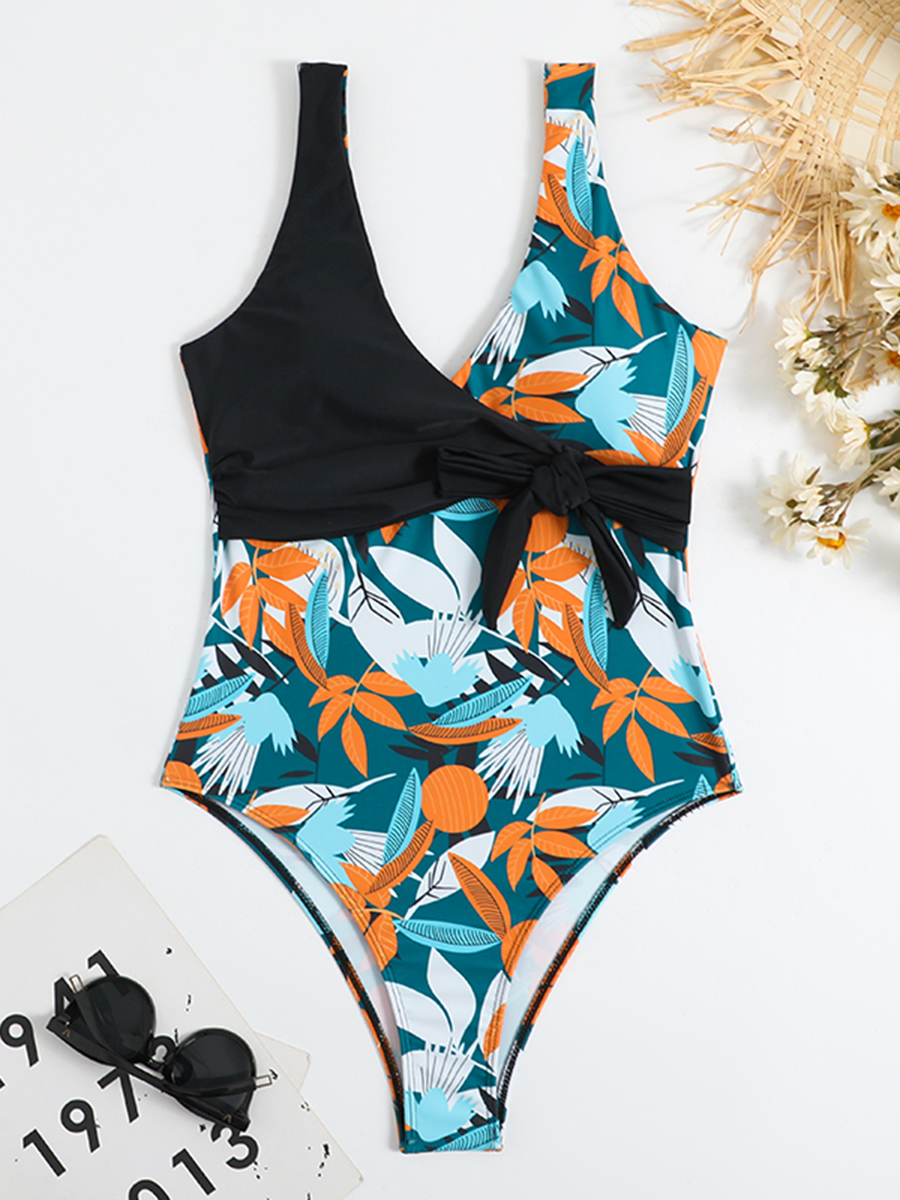2025 Tropical Print Knot Side Belted Swimsuit One Piece Swimwear Women Padded Bathing Suit Female Swimming Summer Beachwear