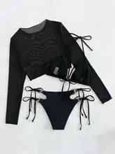 3 PCS Mesh Sheer Long Sleeve Strappy Bikini Female Swimsuit Women Swimwear Three-piece Bikini set Bather Bathing Suit Swim Lady