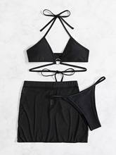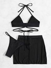 3 Piece Halter Thong Bikini Solid Swimsuit & Beach Shirt Black Swimwear Women 2025 Bather Bathing Swimming Suit Female Beachwear