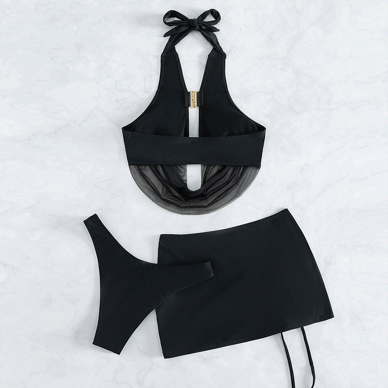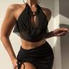 3 Piece Solid Halter Bikini 2025 Women Swimsuit & Beach Skirt Black Swimwear Bathers Bathing Swimming Suit Female Beachwear
