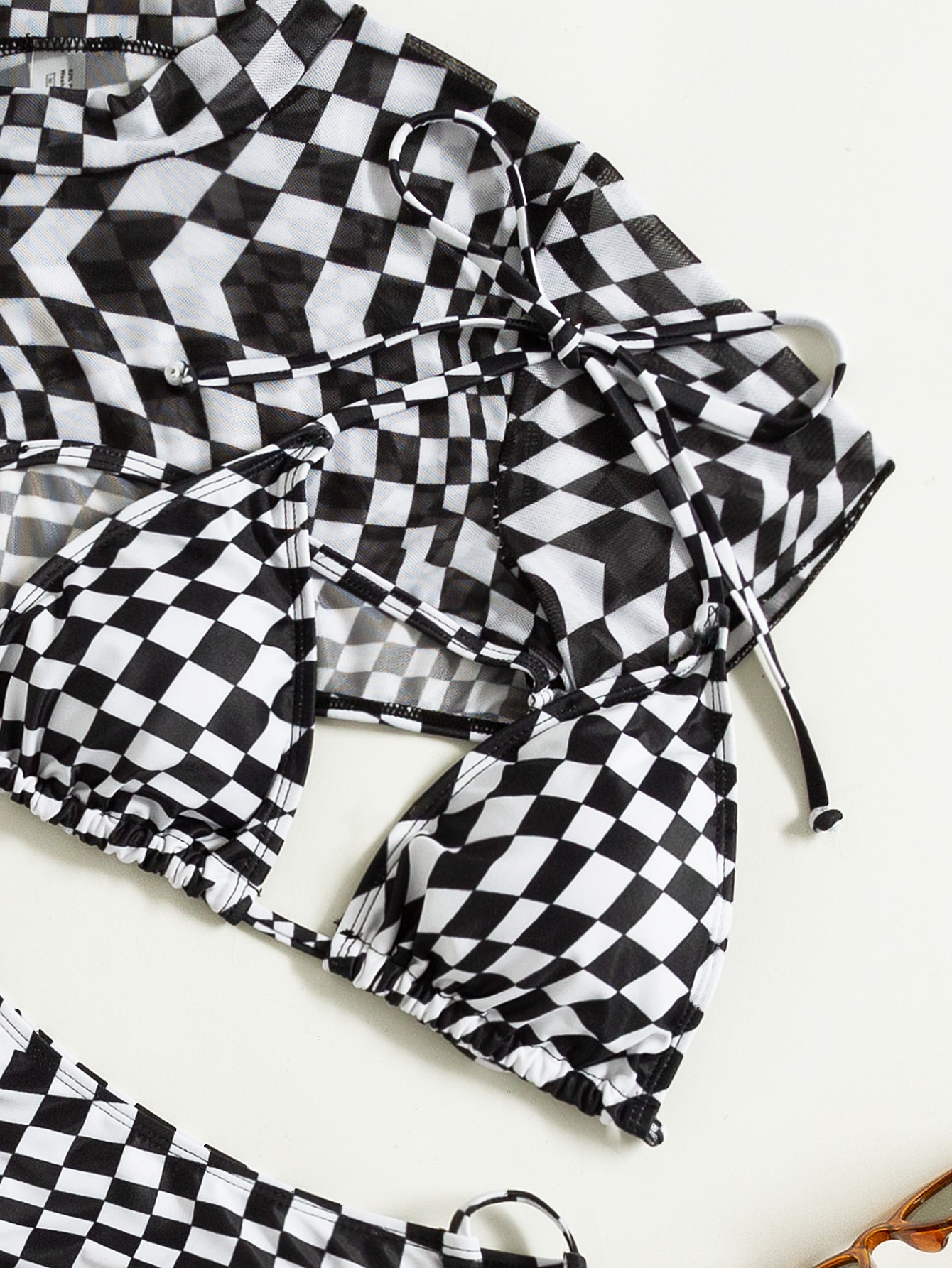 3 Pieces Checkered Tie Side Bikini 2025 Women With Cover Up Top Swimwear Female Swimsuit Beach Wear Bathing Swimming Suit Summer