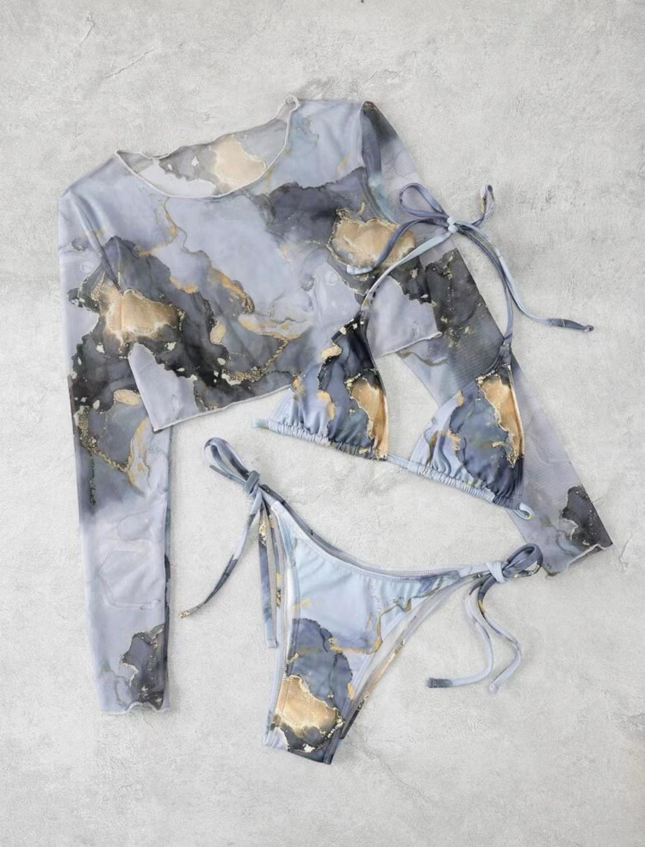 3 Pieces Printed Bikini 2025 Women Swimsuit & Long Sleeve Top Set Swimwear Female Beachwear Bathers Bathing Swimming Suit Summer