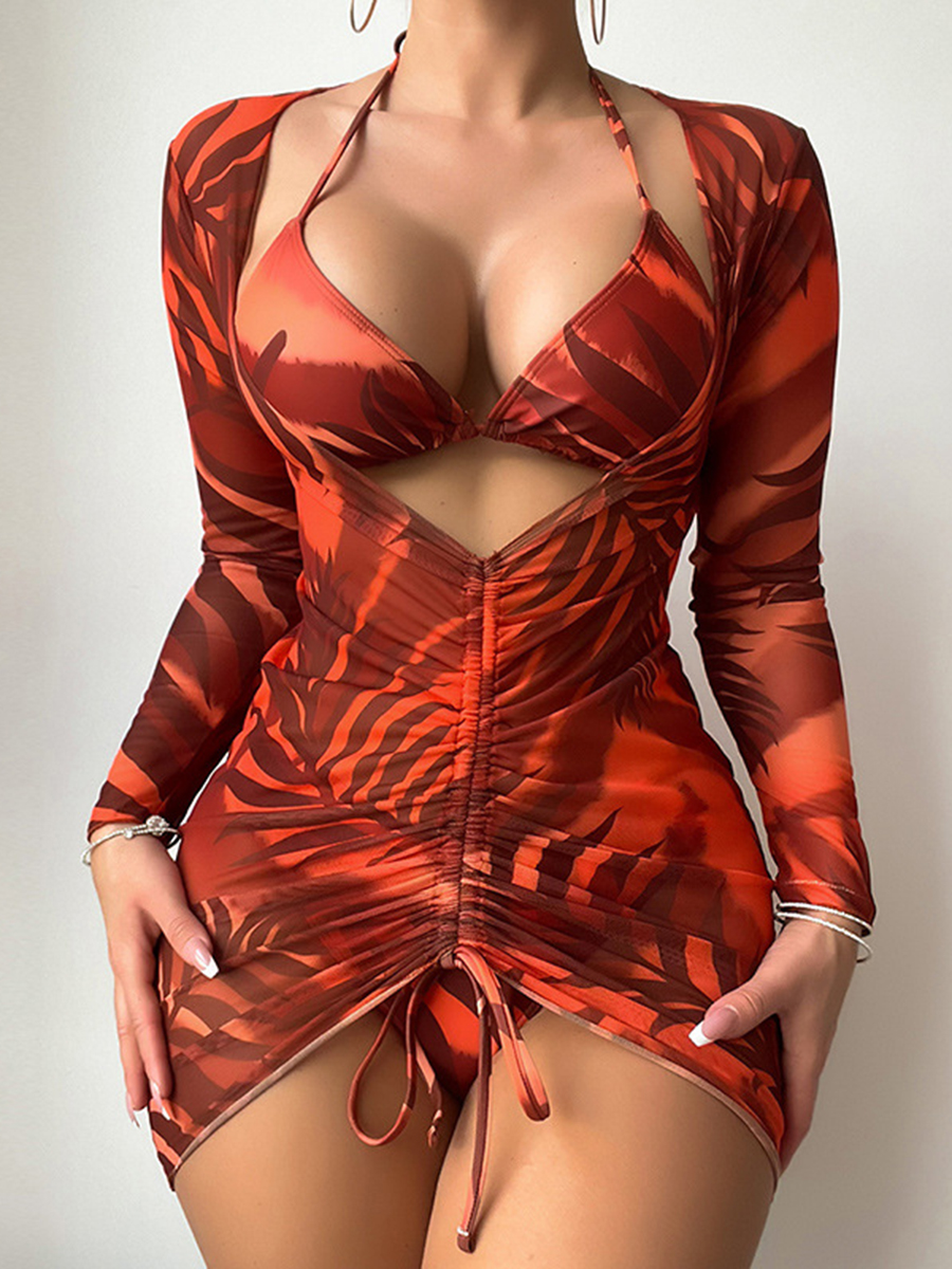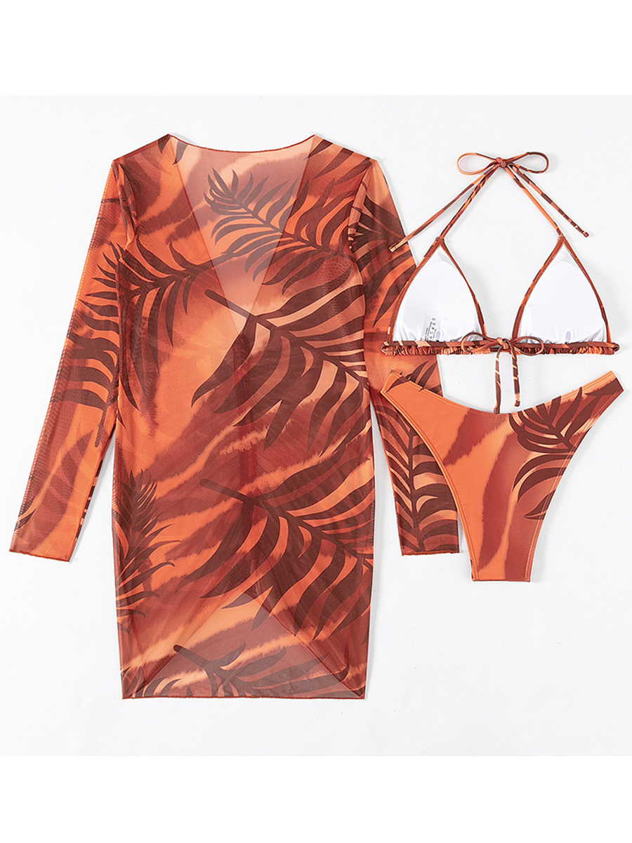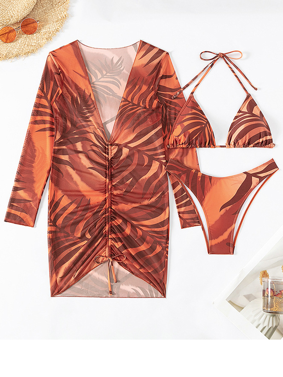 3 Pieces Triangle Halter String Bikinis & Long Sleeve Tops Swimsuit Women Swimwear Female Bathers Bathing Swimming Swim Suit