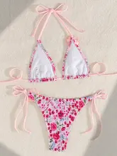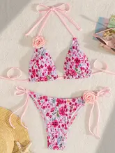 3D Flowers Printed Pleated Bikini Female Swimsuit Women Swimwear Two-pieces Bikini Set Halter Brazilian Bather Bathing Suit Swim