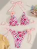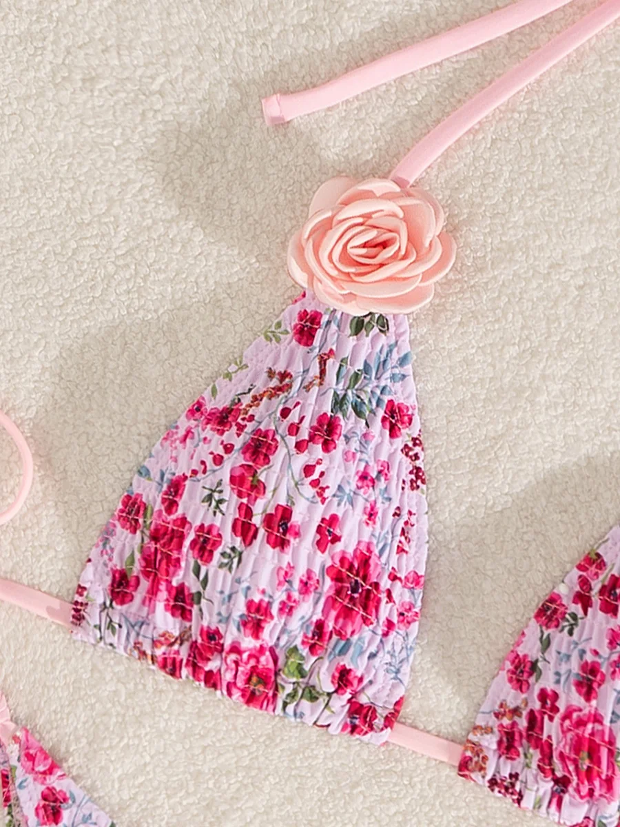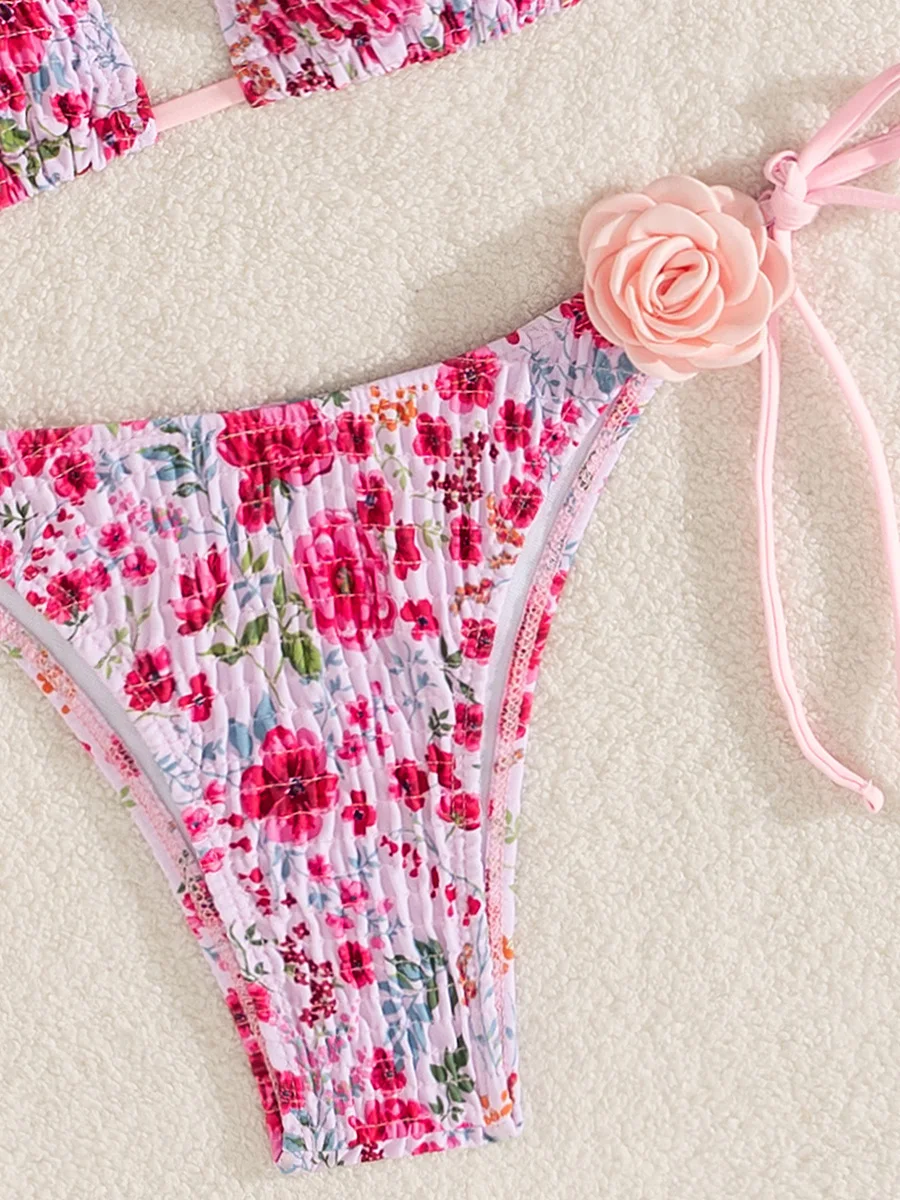 3D Flowers Printed Pleated Bikini Female Swimsuit Women Swimwear Two-pieces Bikini Set Halter Brazilian Bather Bathing Suit Swim