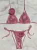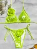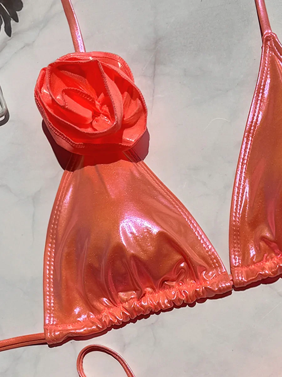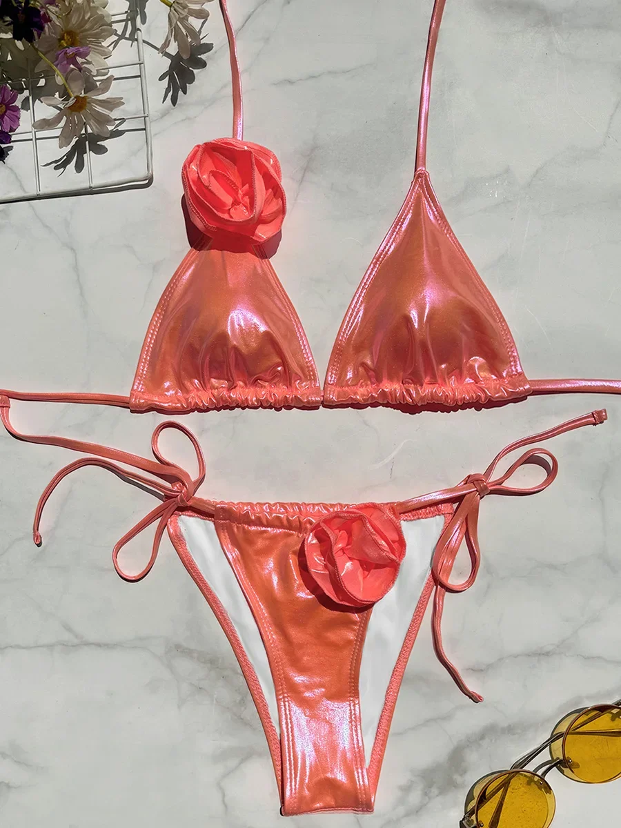 3D Flowers PU Leather Halter Strappy Bikini Women Swimwear Female Swimsuit Two-pieces Bikini Set Mini Micro Bathing Suit Swim