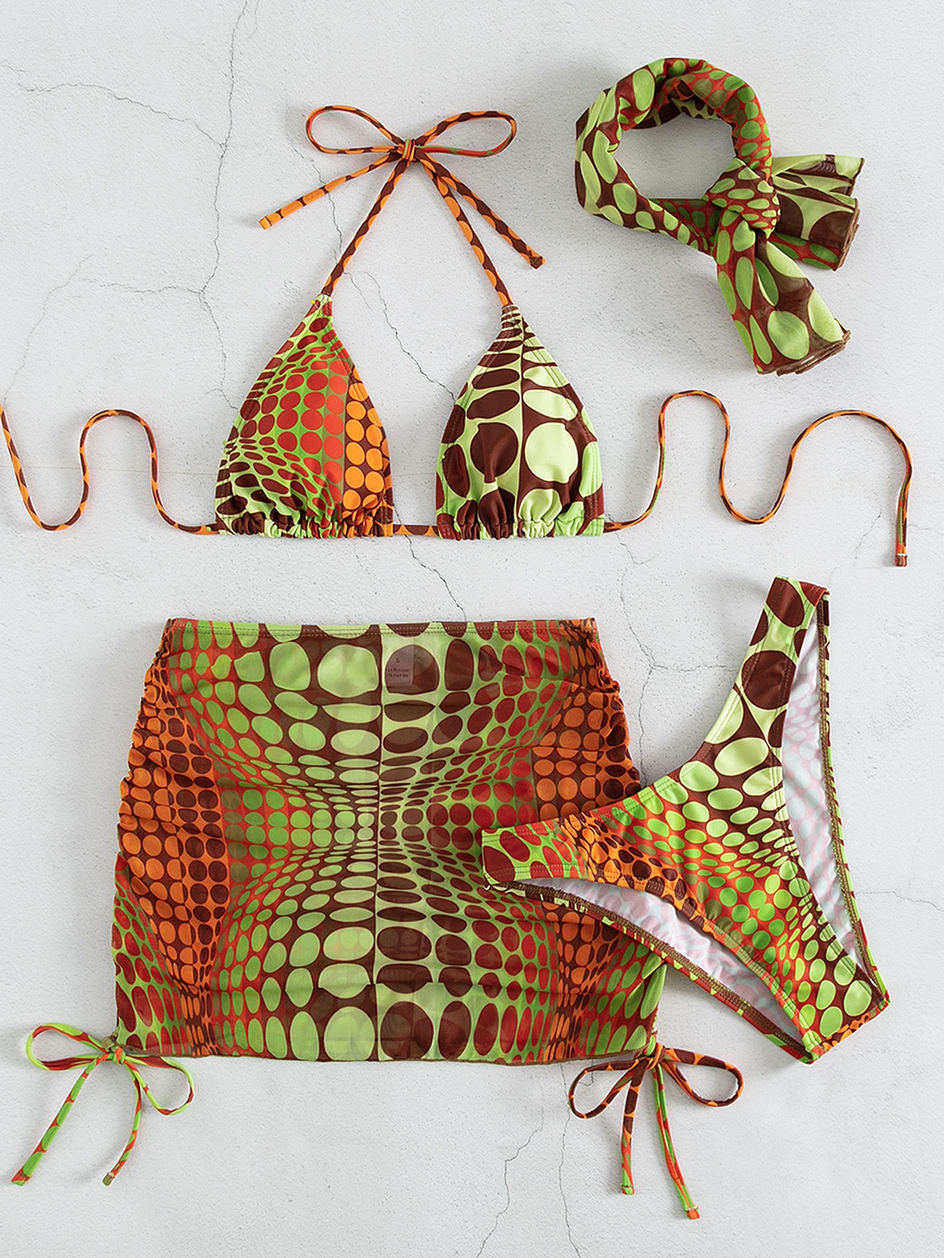 4 Pieces Random Dot Print Tie Side Halter Bikinis Swimsuit & Beach Skirt Swimwear Women 2025 Bathing Swimming Suit Female