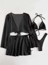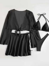 4 Pieces Thong Bikini 2025 Women With Top and Dress Black Swimwear Female Halter Swimsuit Beachwear Bathing Swimming Suit Summer