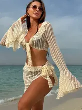 4PCS Halter Mesh Sarong Long Sleeve Bikini Female Swimsuit Women Swimwear Four-pieces Bikini Set Bathing Suit Swim Beachwear
