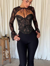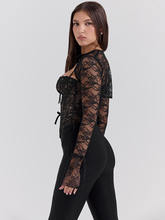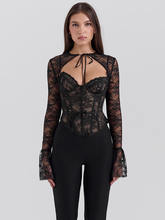 Black Lace Mini Shirts Tops Women Elegant Hollow Out Sheer Flare Long Sleeve Slim Club Party Tops Clubwear