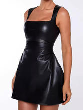 Black PU Leather Mini Dress For Women Robe Square Collar Sleeveless Backless High Waist A-line Club Dress