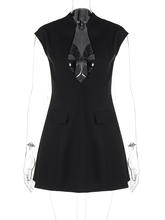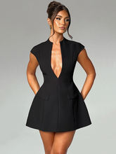 Black Sleeveless Mini Dress For Women Zipper Deep V Neck Two Pocket A-line Night Club Party Dress Elegant