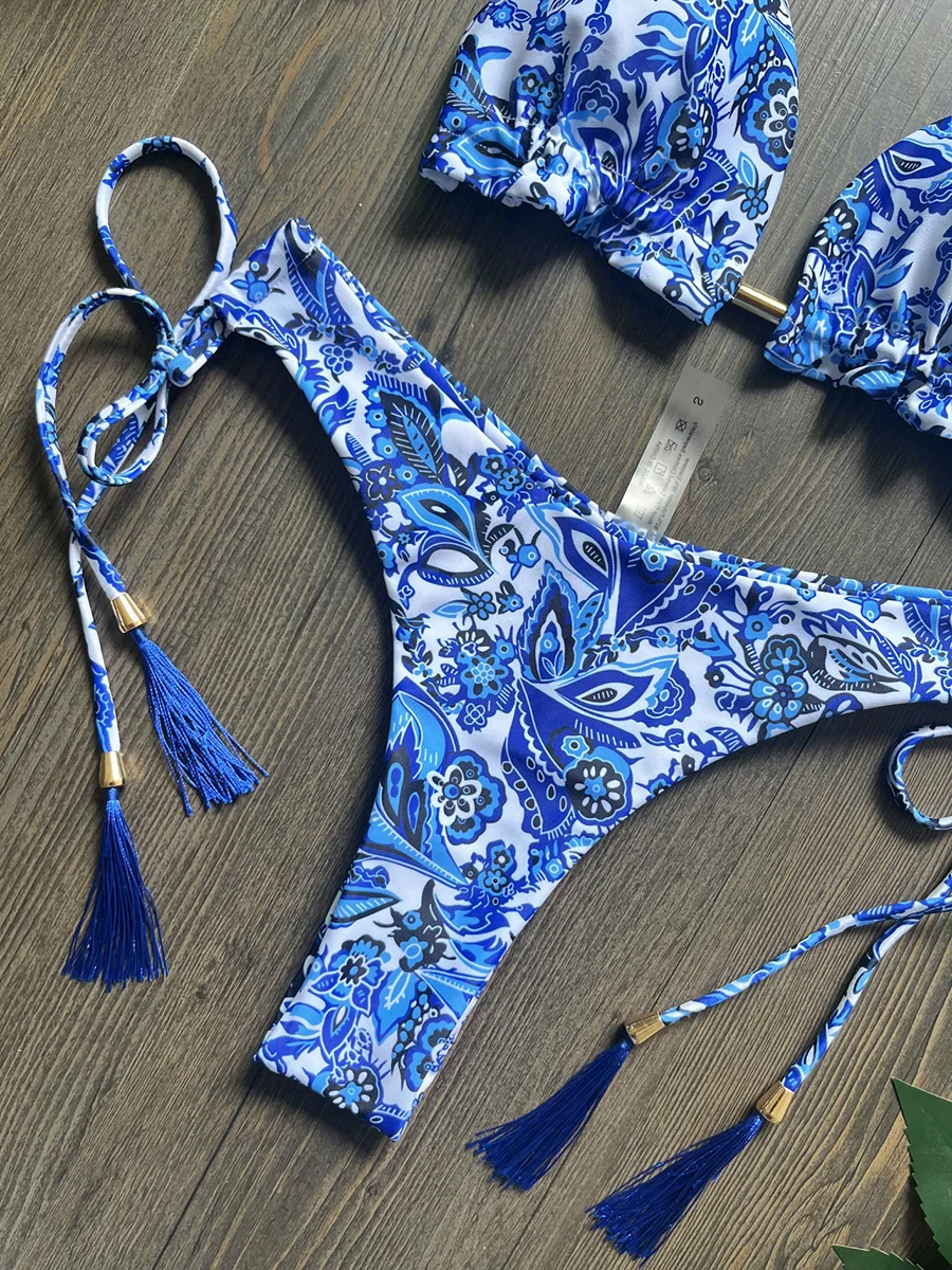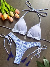 Blue and White Porcelain Printed Halter Brazilian Bikini Female Swimsuit Women Swimwear Two-pieces Bikini Set Bathing Suit Swim