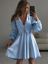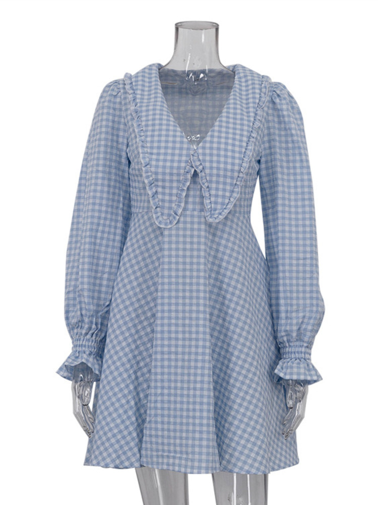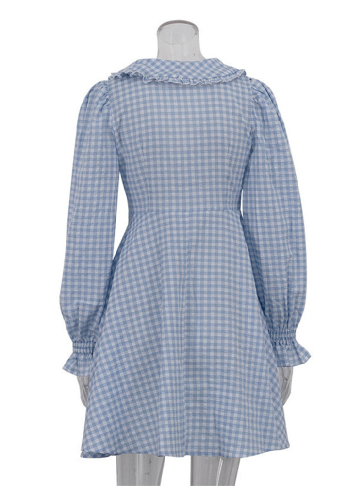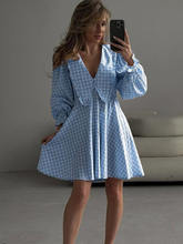 Bow Collar Plaid A-line Midi Dress For Women Autumn Zipper Flare Sleeve High Waist Loose Dress Elegant Dresses