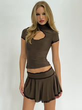 Brown Skirt Two Piece Sets Women Hollow Out Turtleneck Short Sleeve T-shirt And Mini Skirt Femme Skirt Sets New