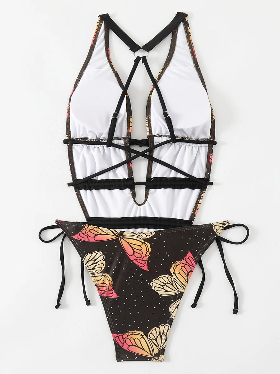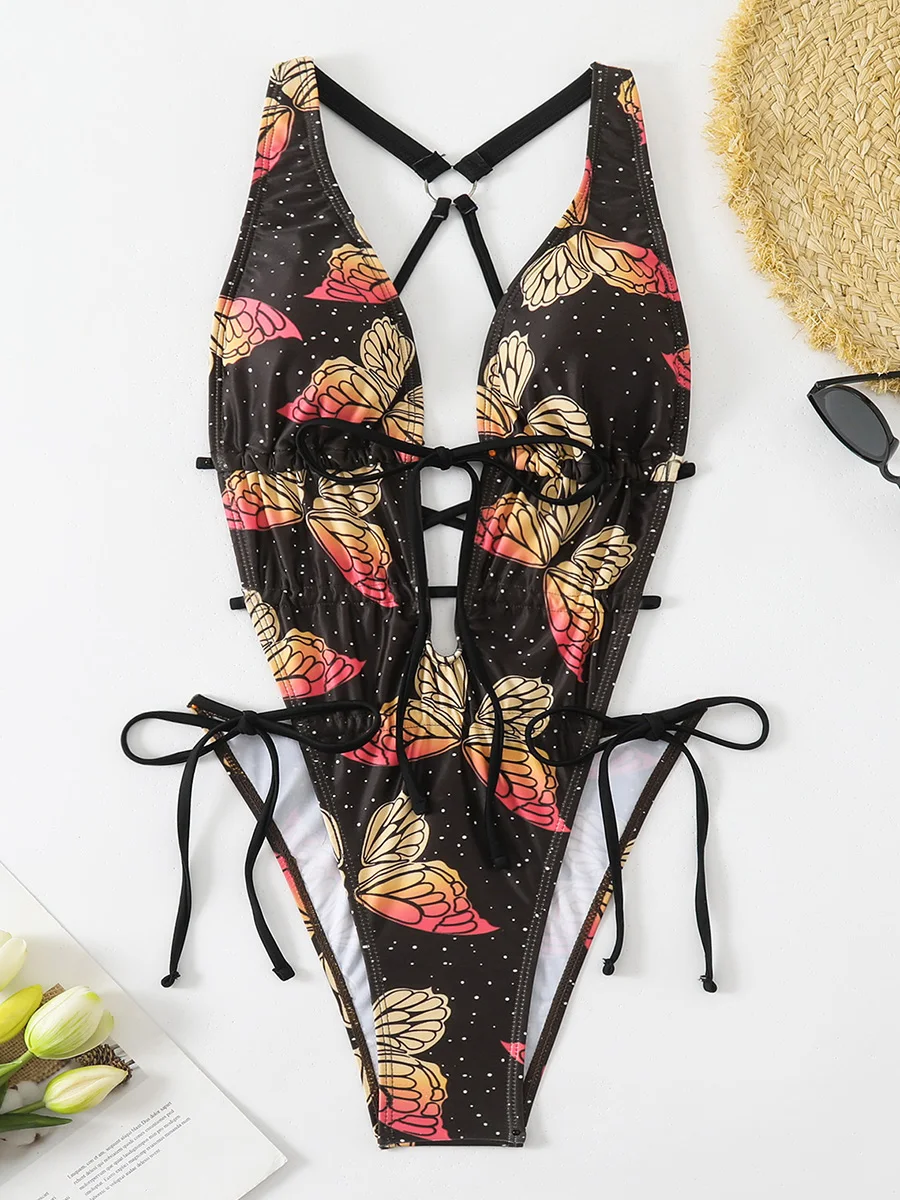 Butterfly Printed Deep V Neck Knotted Women Swimwear One Piece Swimsuit Female High Cut Monokini Backless Bathing Suit Swim Lady