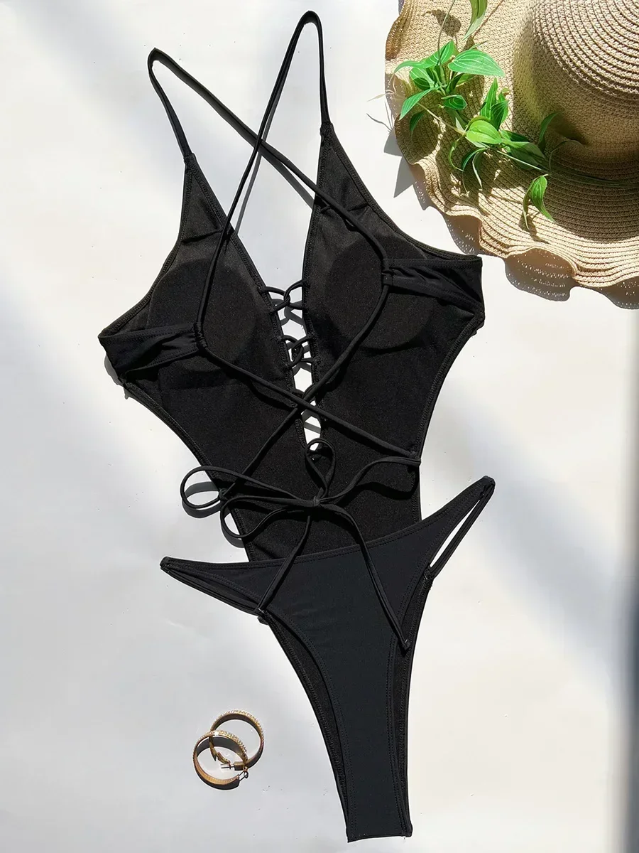 Deep V Neck Cross Backless Women Thong Swimwear One Piece Swimsuit Female Monokini High Leg Cut Bather Bathing Suit Swim