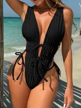 Deep V Neck Knotted Lace Up Women Swimwear One Piece Swimsuit Female High Leg Cut Monokini Bather Bathing Suit Swim Beachwear