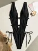 Deep V Neck Knotted Lace Up Women Swimwear One Piece Swimsuit Female High Leg Cut Monokini Bather Bathing Suit Swim Beachwear
