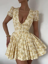 Deep V Neck Print Mini Dress For Women Lace-up Short Sleeve A-line Pleated Dress Elegant Clothes