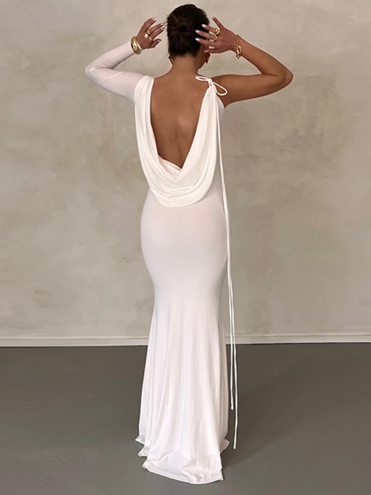 Elegant Backless Maxi Dress For Women Robe 2025 Spring V Neck One Sleeve Lace-up Party Long Dress Vestido