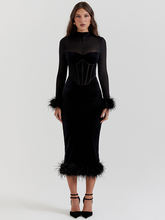 Elegant Feather Midi Dress For Women Black Sheer Long Sleeve Backless Bodycon Club Party Long Dress
