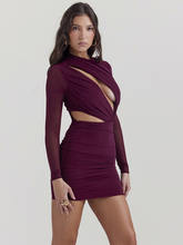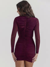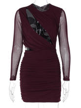 Elegant Hollow Out Mini Dress For Women Wine Red O Neck Sheer Long Sleeve Bodycon Club Party Dress Vestidos