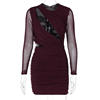 Elegant Hollow Out Mini Dress For Women Wine Red O Neck Sheer Long Sleeve Bodycon Club Party Dress Vestidos