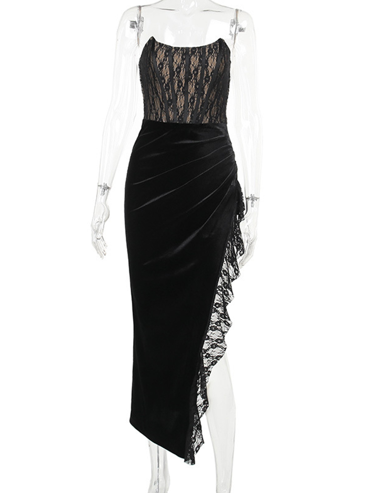 Elegant Lace Strapless Maxi Dress For Women Black Sleeveless Backless Bodycon Club Party Long Dress