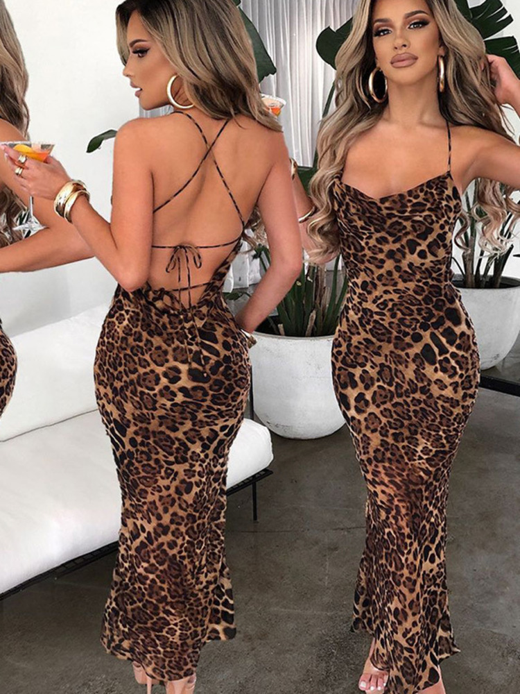 Elegant Leopard Print Maxi Dress For Women Summer Club Party Dresses Female Spaghetti Strap Sleeveless Long Dress