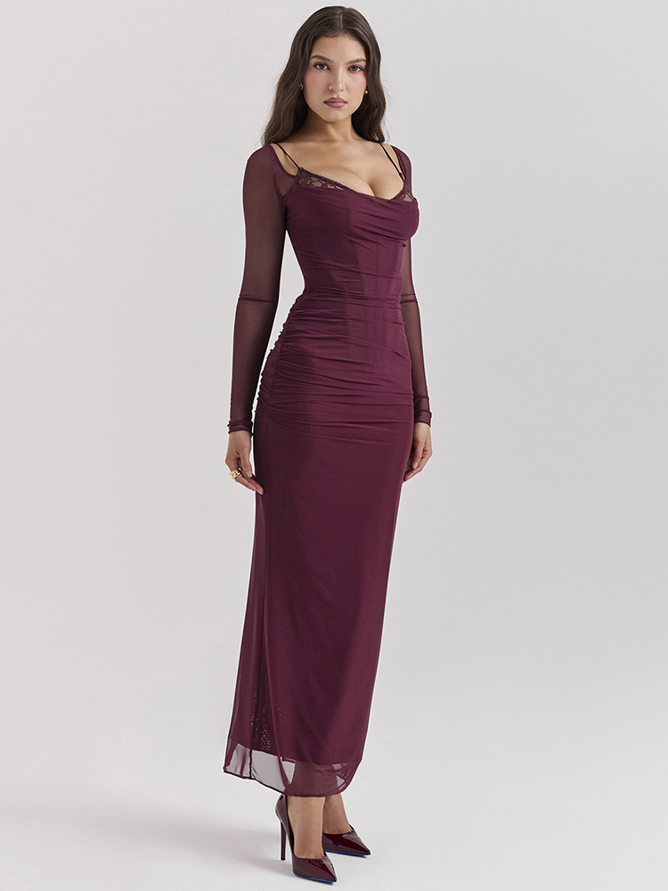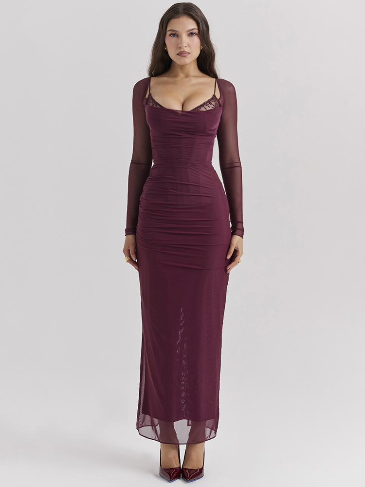 Elegant Sheer Long Sleeve Maxi Dress For Women Mesh Strapless Backless Club Party Long Dress 2024