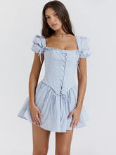Elegant Short Puff Sleeve Mini Dress Women Square Collar Backless A-line Pleated Club Party Dress Vintage