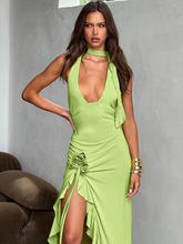 Flower Draped Split Long Dress For Women Halter Deep V Neck Sleeveless Backless Bodycon Club Party Long Dress