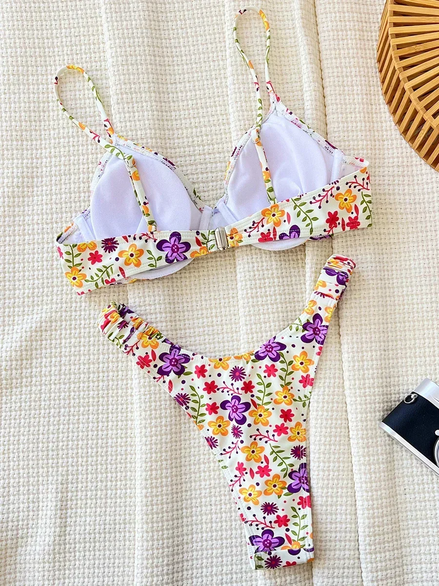 Flowers Printed Underwired High Cut Bikini Female Swimsuit Women Swimwear Two-pieces Bikini Set Triangle Bathing Suit Swim Lady