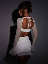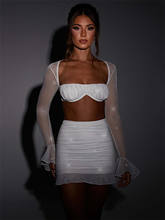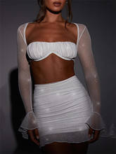 Glitter Mesh Dress Set Women Strapless Flare Sleeve Crop Top And Mini Skirt Sets Club Party Sparkle Two Piece Set