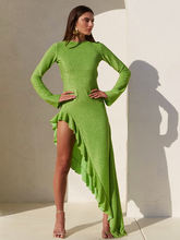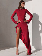 Glitter Thigh High Split Maxi Dress For Women Gown O Neck Long Sleeve Backless Ruffled Shiny Long Dress Gown