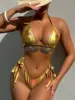 Golden PU Faux Leather Bikini Women Swimwear Female Swimsuit Two Pieces Bikini Set Halter Bathing Suit Swim Summer Beach Wear
