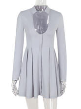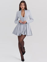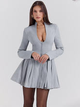 Gray Long Sleeve Mini Dress Women Solid V Neck High Waist A-line Club Party Pleated Dress Elegant Clubwear