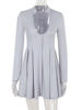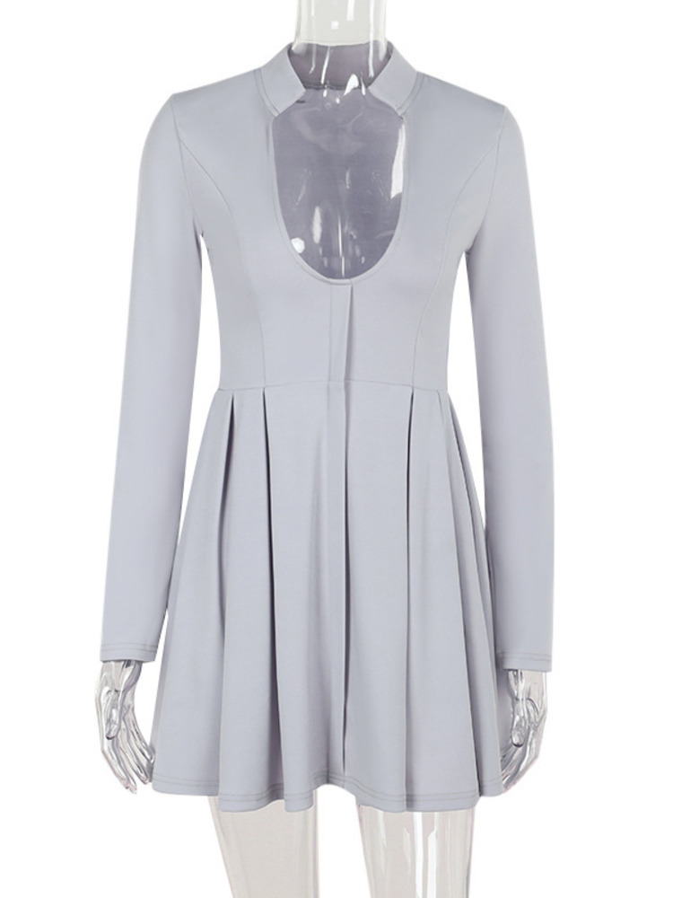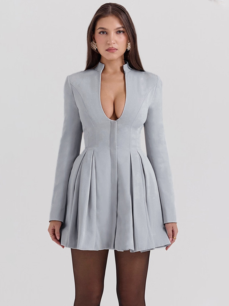 Gray Long Sleeve Mini Dress Women Solid V Neck High Waist A-line Club Party Pleated Dress Elegant Clubwear