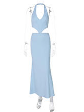 Halter Backless Maxi Dress For Women Gown Blue Deep V Neck Lace-up Sleeveless High Waist Bodycon Club Long Dress