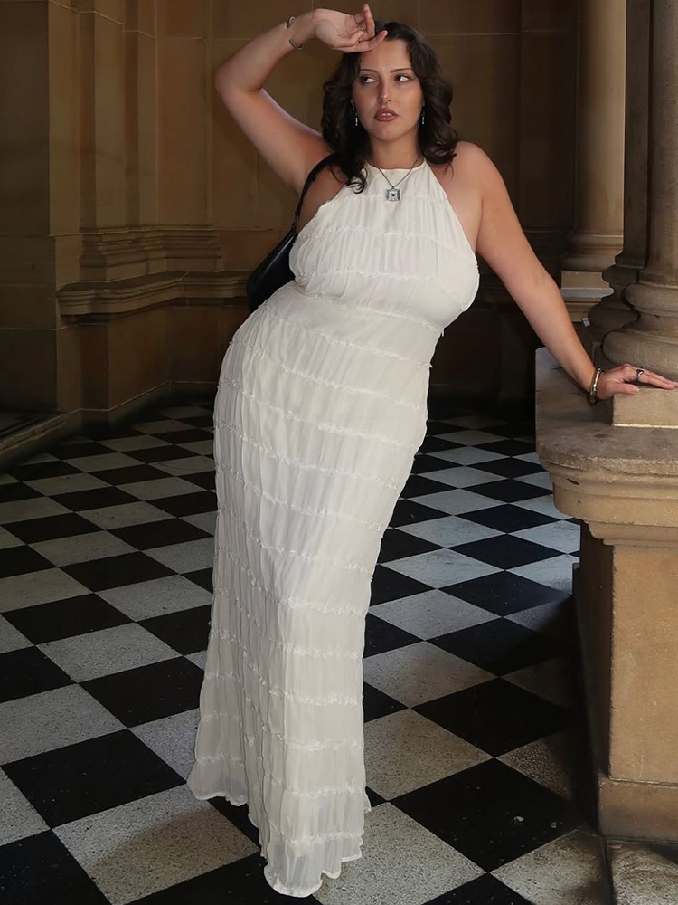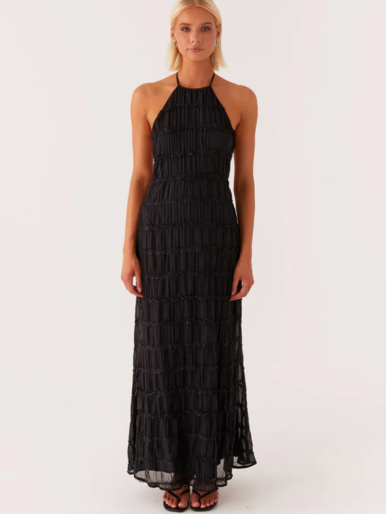Halter Backless Maxi Dress For Women Spring Summer Lace-up Sleeveless Pleated Beach Holiday Long Dress Elegant