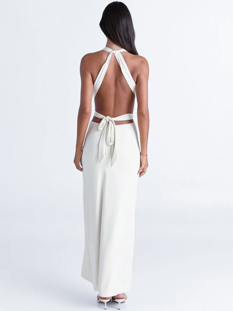 Halter Deep V Neck Maxi Dress For Women Solid Sleeveless Backless Lace-up Club Party Long Dress Vestido