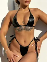 Halter PU Faux Leather Mini Micro Thong Bikini Women Swimsuit Female Swimwear Two Pieces Bikini set Brazilian Bathing Suit Swim